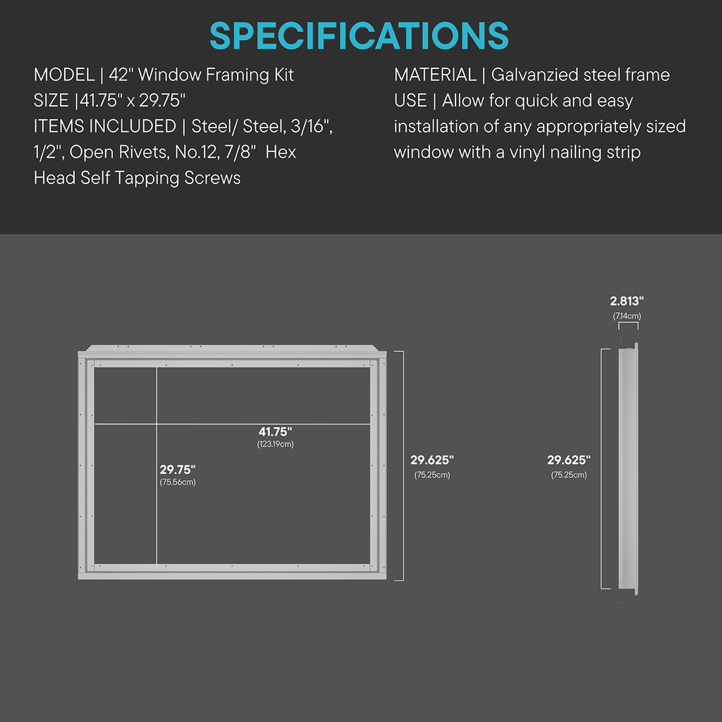 - Galvanized steel frame components. Includes all necessary hardware and edge trim for the top of the window for a clean appearance and watershed seal.